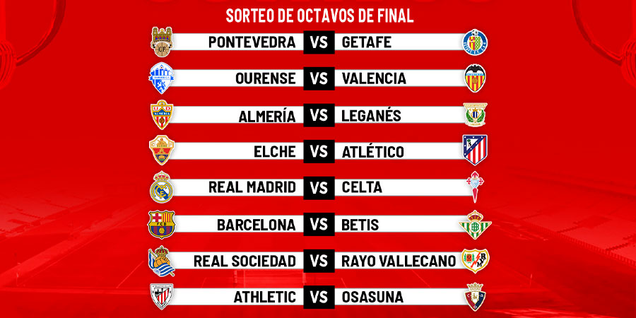 El sorteo de los emparejamientos de octavos de la Copa del Rey se realizó este miércoles en la Ciudad del Fútbol de Las Rozas, sede de la Federación Española de Fútbol (RFEF). Real Madrid-Celta, Barcelona-Betis, Real Sociedad-Rayo y Athletic-Osasuna son los emparejamientos entre equipos de Primera, con el primero de los equipos de cada partido actuando como local. Además, dos equipos de Segunda siguen también en el torneo copero y jugarán como locales en octavos. El Almería se enfrentará al Leganés y el Elche al Atlético de Madrid.